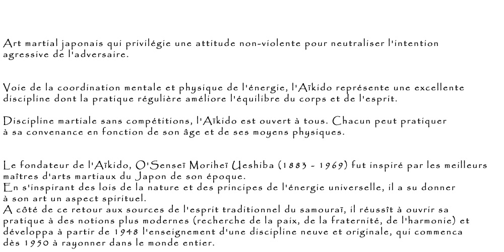 Discipline martiale sans compétitions, l'Aïkido est ouvert à tous. Chacun peut pratiquer à sa convenance en fonction de son âge et de ses moyens physiques.